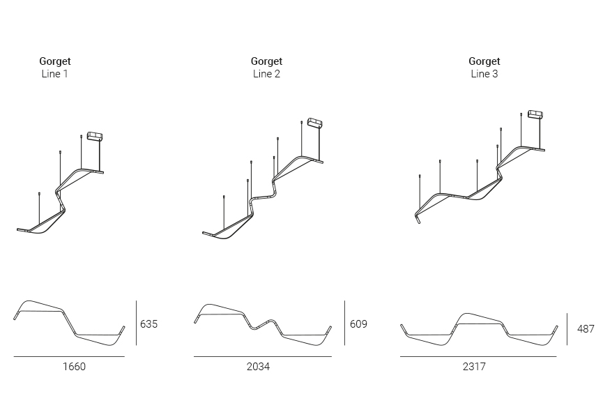 Gorget Line to koncepcja systemu liniowego na wyższym poziomie. Jego nieregularny, unikalny kształt doskonale sprawdzi się w korytarzach i holach. Światło może być emitowane zarówno w górę, jak i w dół, zapewniając zarówno efekt dekoracyjny na przestrzeni sufitu, jak i funkcjonalne oświetlenie podłogowe.