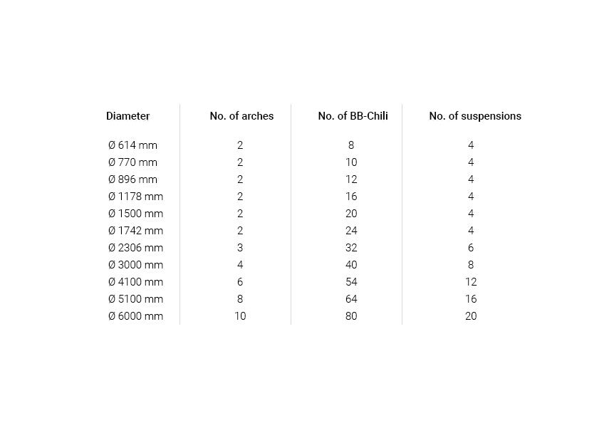 W zależności od wybranej średnicy oprawy Loop budowane są z różnej liczby precyzyjnie zaprojektowanych łuków — od dwóch w mniejszych formach, aż do dziesięciu w największych konfiguracjach. Taka modułowa konstrukcja pozwala swobodnie operować skalą i proporcjami, dopasowując oprawę zarówno do kameralnych wnętrz, jak i rozległych przestrzeni komercyjnych. Różnorodność średnic daje pełną kontrolę nad charakterem kompozycji, umożliwiając tworzenie spójnych, a jednocześnie zróżnicowanych aranżacji świetlnych opartych na jednej, konsekwentnej formie.