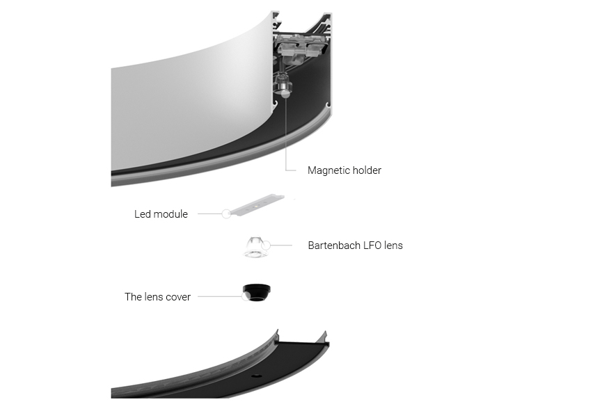 Proporcje tego profilu są wyważonym kompromisem pomiędzy wysmakowanym dizajnem, a technologią modułowej oprawy. Wkład oświetleniowy instalowany jest za pomocą magnesów co w znacznym stopniu przyśpiesza montaż i serwisowanie oprawy.