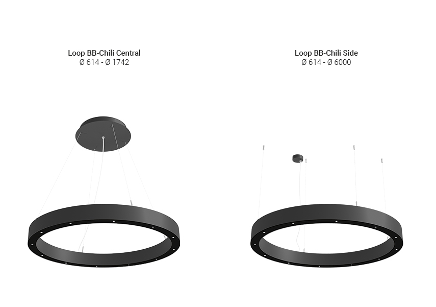 W profilach Loop zaproponowano dwie możliwości montażu zwieszanego - z puszką sufitową centralną lub boczną. Montaż z puszką sufitową centralną stosowany jest w oprawach o średnicy od Ø 614 do Ø 1742 mm.