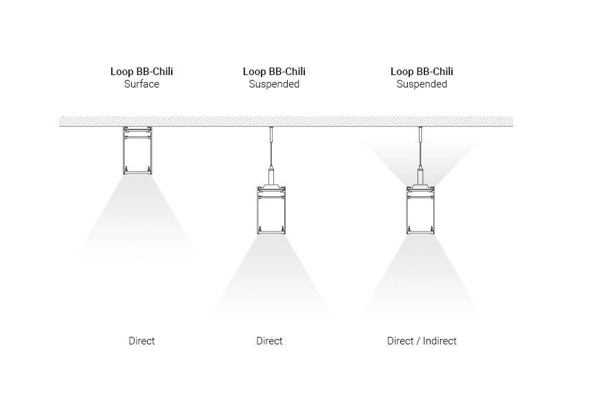 W modułach oświetlenia punktowego takich jak Loop Chili występują dwie wersje rozszyłu światła - bezpośredni lub bezpośredni / pośredni. W każdej z tych wersji możliwe jest stosowanie dwóch kątów rozsyłu światła - 30 i 60 stopni. Emisja światła bezpośredniego realizowana jest poprzez technologię Chili. Natomiast rozsył pośredni realizują moduły liniowe wyposażone w dyfuzor satynowy.