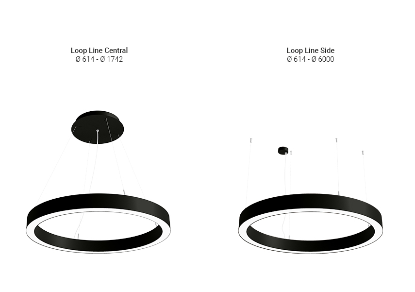 W profilach Loop zaproponowano dwie możliwości montażu zwieszanego - z puszką sufitową centralną lub boczną. Montaż z puszką sufitową centralną stosowany jest w oprawach o średnicy od Ø 614 do Ø 1742 mm.