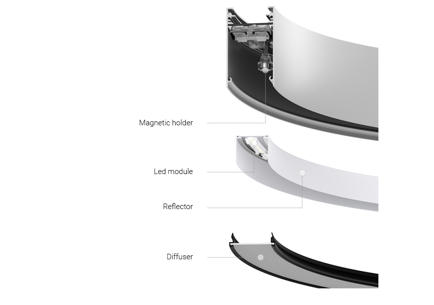 Proporcje tego profilu są wyważonym kompromisem pomiędzy wysmakowanym dizajnem, a technologią modułowej oprawy. Wkład oświetleniowy instalowany jest za pomocą magnesów co w znacznym stopniu przyśpiesza montaż i serwisowanie oprawy.