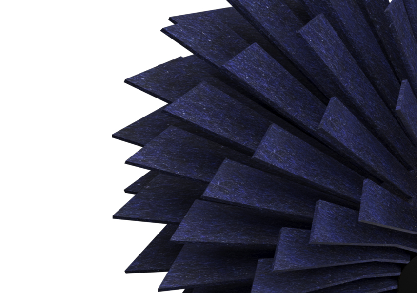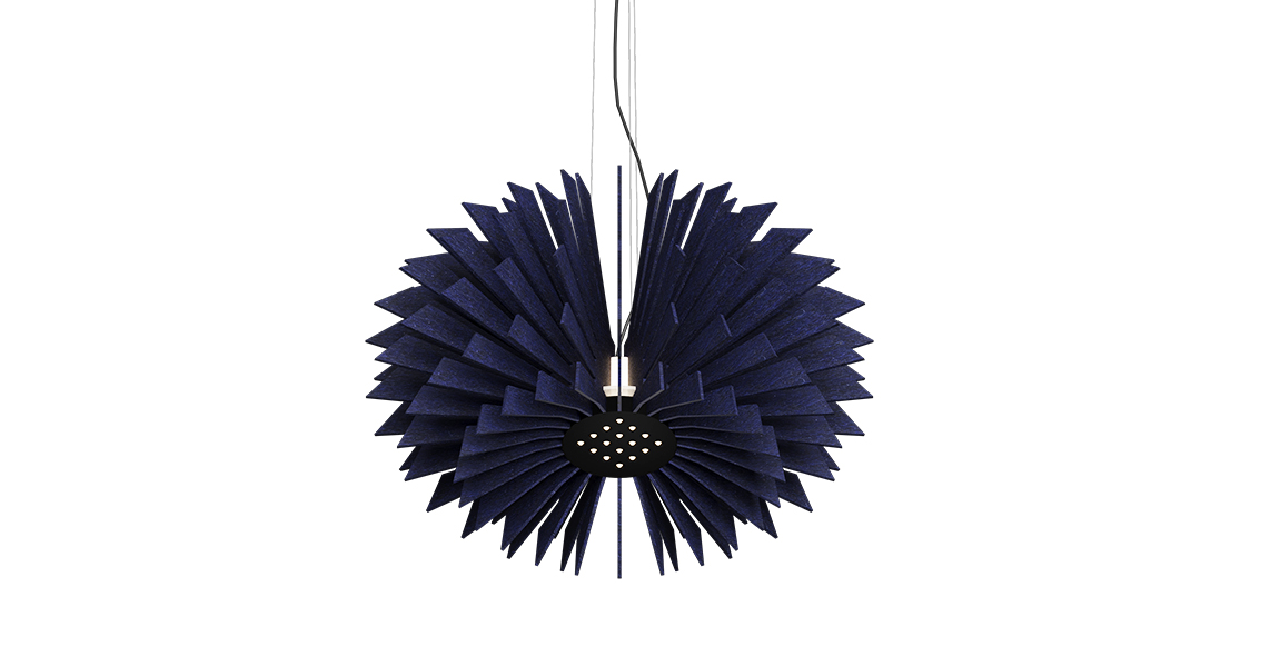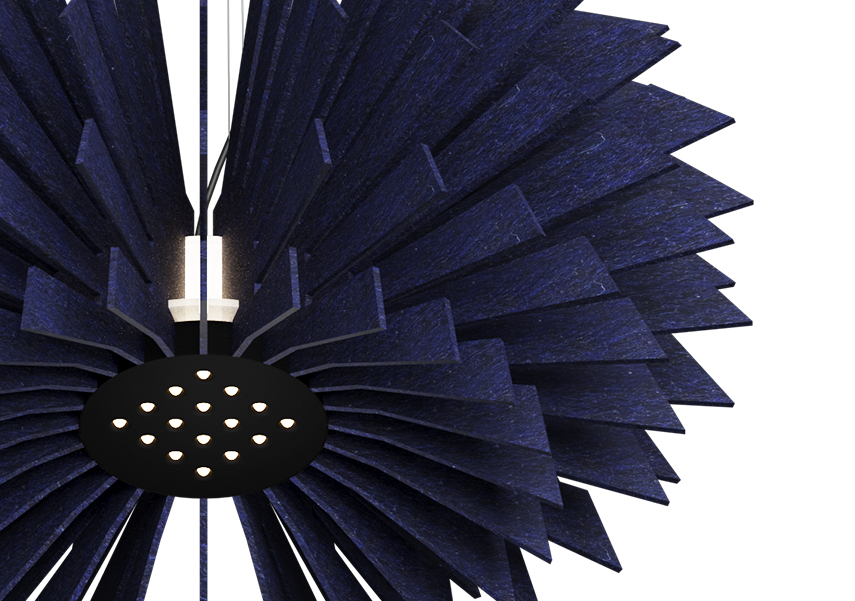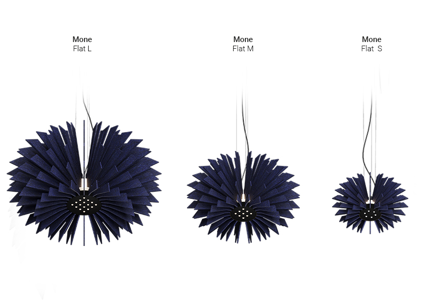 Mone to wysokiej jakości oprawa akustyczna, która łączy w sobie wyjątkową absorpcję dźwięku z zaawansowanymi możliwościami oświetleniowymi. Jej charakterystyczny, żebrowany abażur kryje źródło światła „multicone”, zapewniając skupione oświetlenie punktowe. Design dopełnia nastrojowe ambientowe oświetlenie w trzech wariantach kolorystycznych, delikatnie podkreślając warstwową strukturę filcu, co dodaje jej wizualnej elegancji.