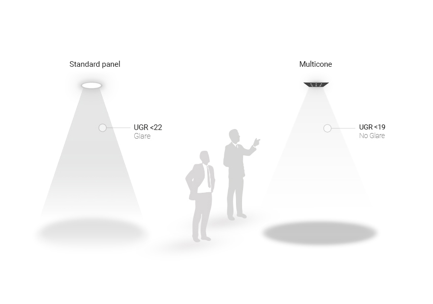 Multicone Panel- Dzięki niskiemu wskaźnikowi UGR (kąt rozsyłu 60° UGR < 19), redukowane jest zjawisko olśnienia i uzyskiwana jest ekskluzywna jakość oświetlenia oraz absolutny komfort widzenia.