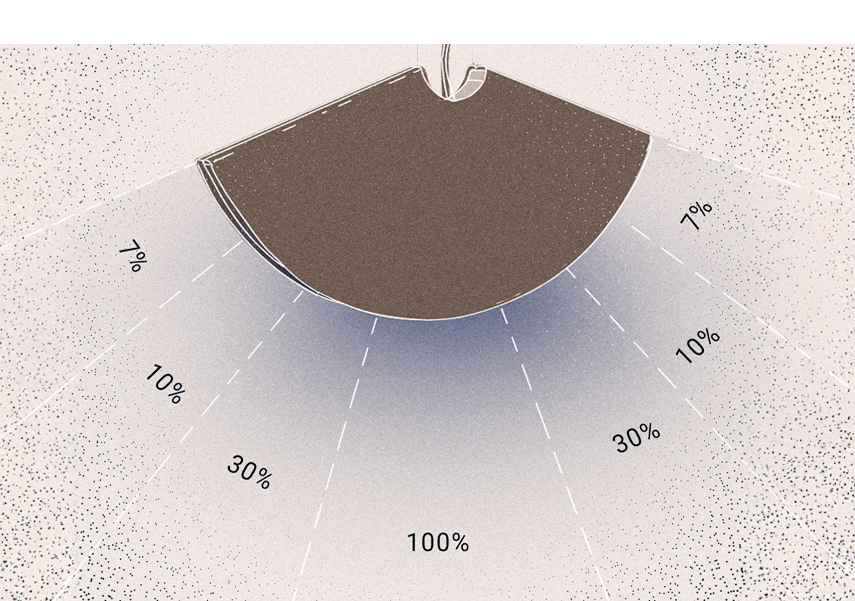 Wyjątkowość modelu Ogi tkwi w unikalnym sposobie rozprowadzania światła. Jego zakrzywiony kształt pozwala na stopniowe i przyjemne rozjaśnianie pomieszczenia. W centrum światło jest najsilniejsze i najbardziej skoncentrowane, wyraźnie oświetlając obszar pod nim. Przesuwając się w górę łuku, w kierunku podniesionych końcówek, rozsył stopniowo słabnie, tworząc wokół przyjemne, rozproszone światło. Ta niezwykła kombinacja jasnego oraz subtelnego oświetlenia pozwala na stworzenie wyjątkowej atmosfery w każdym pomieszczeniu.