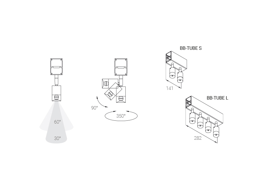 Moduł BB-Tube wykorzystuje zaawansowaną optykę LFO opracowaną w laboratorium Bartenbach, oferując kąty rozsyłu światła 30° lub 60°, co pozwala na precyzyjne dopasowanie iluminacji do różnych potrzeb projektowych. Źródło światła w module jest w pełni regulowane – można je odchylić w płaszczyźnie pionowej i poziomej do 90° oraz obrócić wokół osi nawet do 350°, co daje dużą elastyczność w kierowaniu światłem.