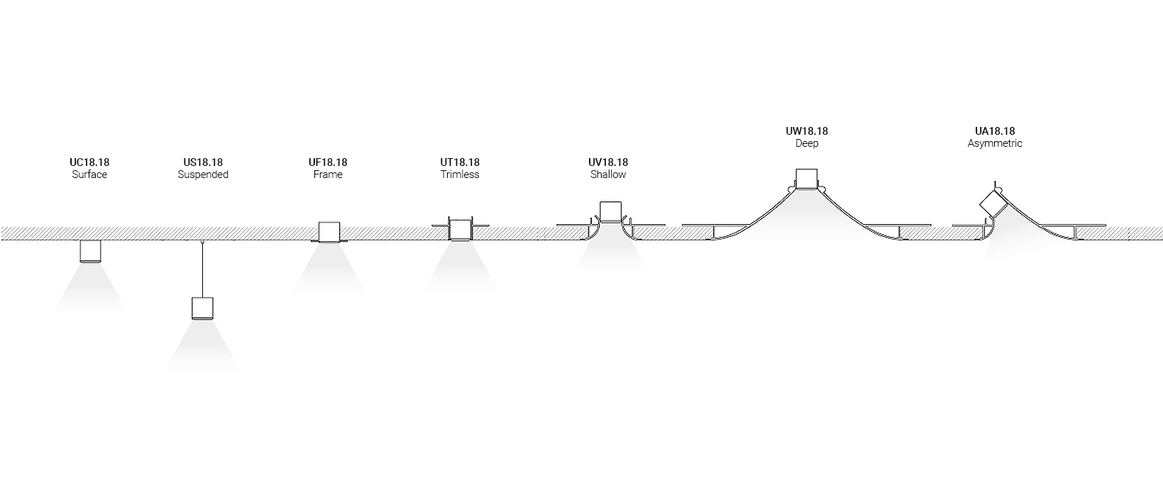 Profile U18.18 to minimalistyczna forma, która kryje w sobie wyjątkową funkcjonalność. Jeden profil oferuje aż siedem wariantów montażu: C – nabudowany, S – zwieszany, F – wbudowany z ramką, T – wbudowany bezramkowy, V – wbudowany płytko cofnięty, W – wbudowany głęboko cofnięty oraz A – wbudowany asymetryczny. Dzięki temu łatwo dopasować rozwiązanie do każdej przestrzeni i projektu.