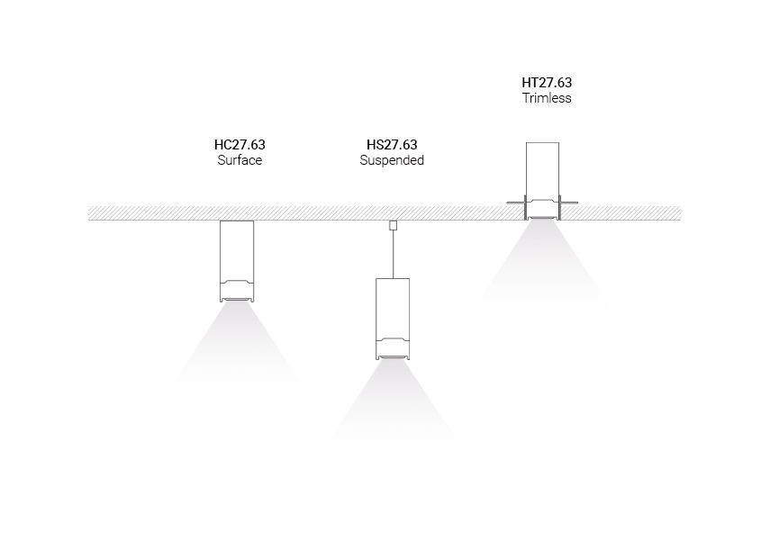 Profile z serii H27 stanowią rozwinięcie najmniejszego profilu z serii U18, oferując jeszcze większą funkcjonalność w kompaktowej formie. Dostępne są w trzech wariantach montażu: C – nabudowany, S – zwieszany oraz T – wbudowany, co pozwala elastycznie dopasować profil do różnorodnych przestrzeni i projektów.